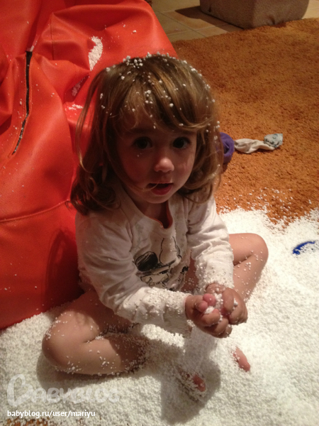слышу столько счастья в её голосе, захожу и вижу Гору мееелкого пенопласта....кидается им смеется .я конечно отреагировала так как надо))).......стала играться вместе с ней)) , и папе тут же отправили фоточку в ответ получили: "Снег пошел?" "какая счастливая Аврора! сейчас приеду вместе поиграем"