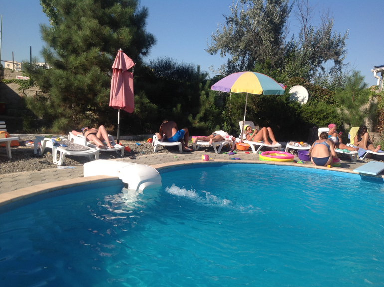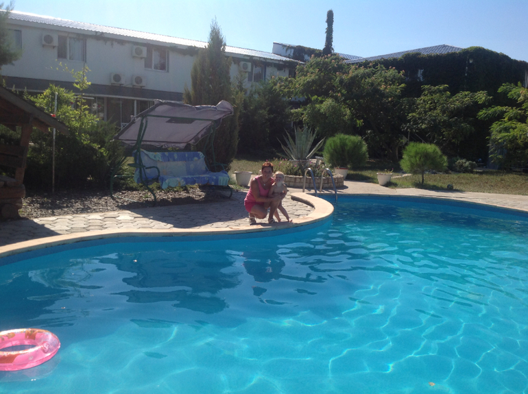 Видите за беседкой дверь номера? Это наш! Очень удобно: можно купаться, пока ребенок спит, или кофе-чат в беседке. А рядом здание белое? Это уже столовая, тоже удобно, что рядом.