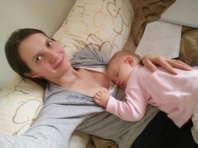 Сегодня у нас что-то совсем странное с режимом - спим весь день:) Настя все мое занятие польским просидела на руках, а потом уснула, хотя и до занятия успела поспать. А мне нужно брюки онести подшивать и пообедать хочется, но она так сладко спит :) и уже час так, и не собирается просыпаться, а я не буду никуда спешить, ведь это такое счастье, когда теплый комочек сопит на груди :))))