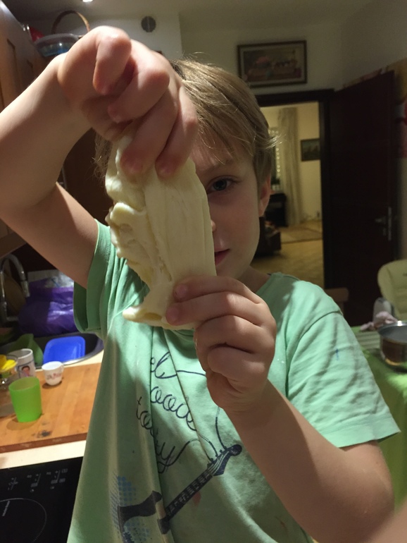 А еще мы на днях сами делали моцареллу! Папа нам привез из Амстердама набор DIY. Там была лимонная кислота, сычужный фермент, соль, термометр, лопаточка и ткань специальная. Никита активно участвовал, особенно понравилось, как молоко сворачивалось и потом лепить шарик из тянучки. Мне тоже понравилось, разве что выход очень маленький - из двух литров фермерского молока всего 100 г готовой моцареллы. Зато Никита впервые ее поел и понравилось! Он вообще сыры не ест, а тут я его убедила, что это почти творог. Вкусно было, но мало :-)