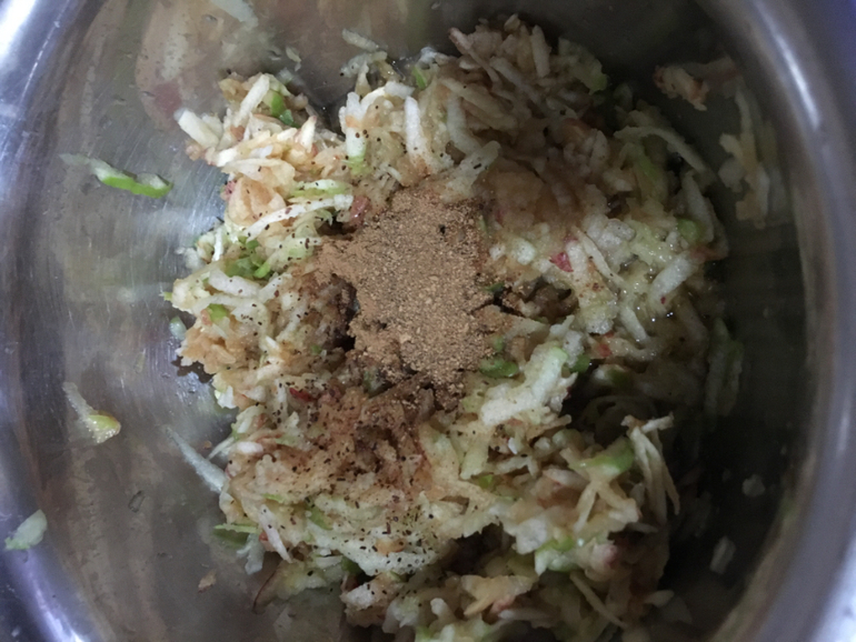 Яблоки натереть на крупной тёрке, добавить сахар и корицу.