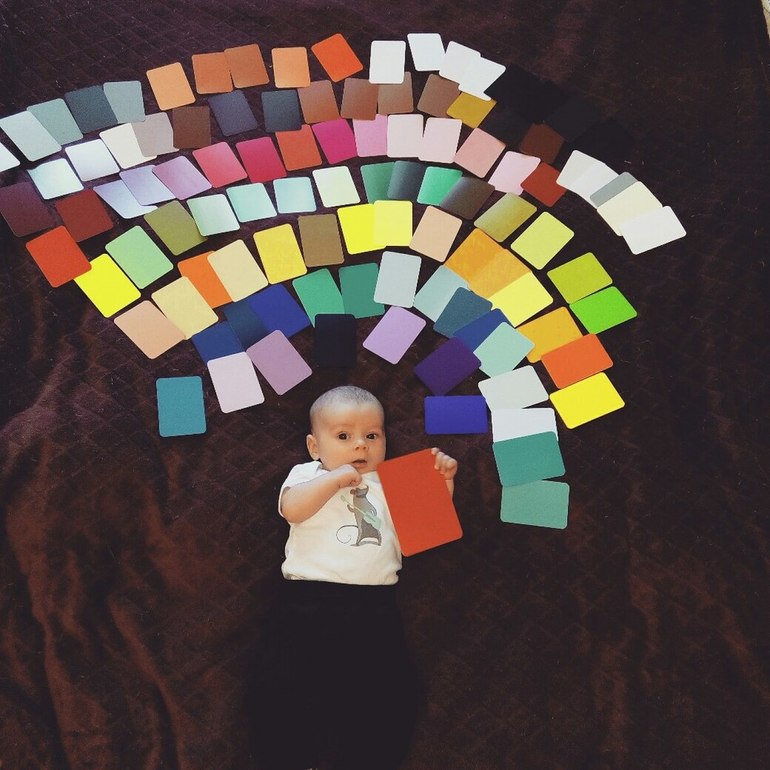 "Творчество с пелёнок" идёт у нас полным ходом. Прошли этап знакомства с 10 основными цветами (большие карточки). Никита с самого начала занятий смотрит карточки одинаково - сосредоточенно, изредка улыбаясь особо полюбившимся. Как я говорила, у нас нет особого разнообразия показов, этого никому не требуется - смотрим в "классическом" варианте, лёжа на пеленальнике. Ну иногда не только на пеленальнике. Показываю карточки только я, папе затея нравится, но себя в роли педагога он пока не рассматривает. Впрочем, Никита и мной вполне доволен, занятия идут у нас хорошо!