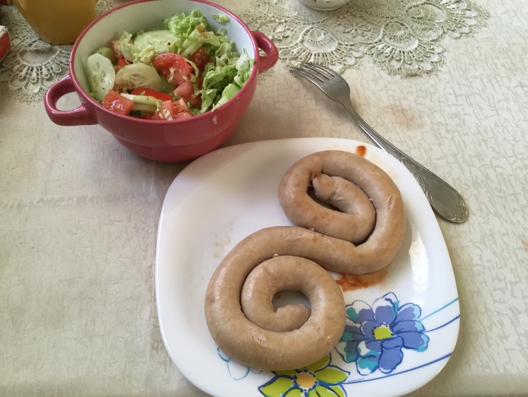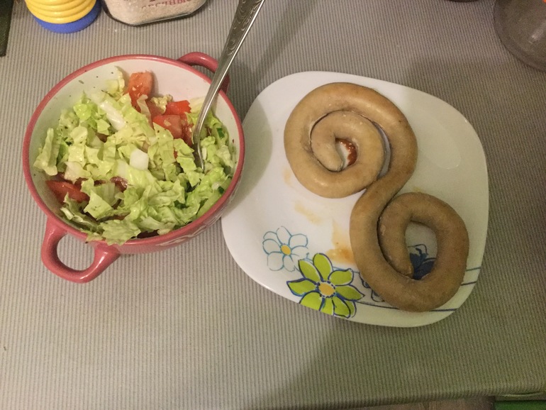 Половина от того что на фото-Салат овощной+куриная купатинка, 2 блинчика на крахмале с творогом+стакан воды