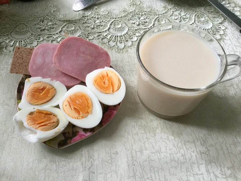 Чай с молоком+2 кусочка ветчина и 1 крипс и 2 вареных яичка