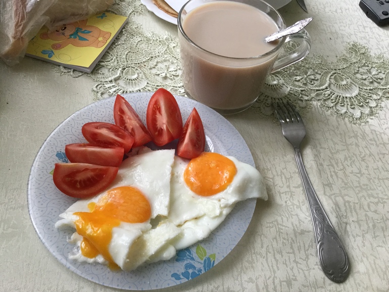 Глазунья, сосиска из индейки, чай и помидорка