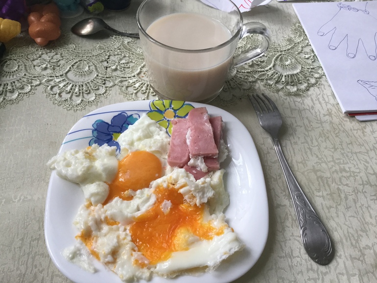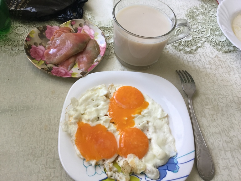 Не хотелось готовить кашу, омлет (с двухжелтковым яичком))семга и чай с молоком))
