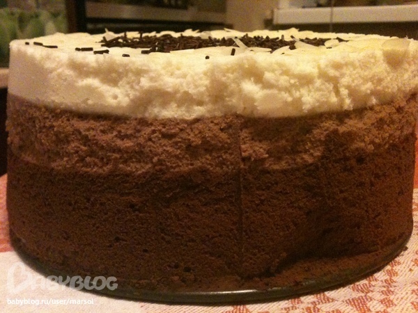 Наш торт-заготовка почти готов – ставим его на ночь в холодильник – чтобы желатин хорошо застыл. (Или, если нет времени. оставляем на 30 мин в морозилке)
