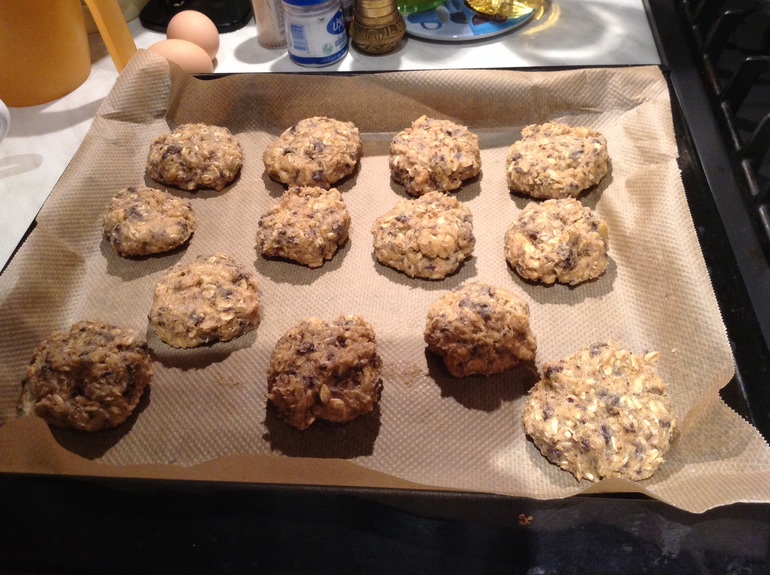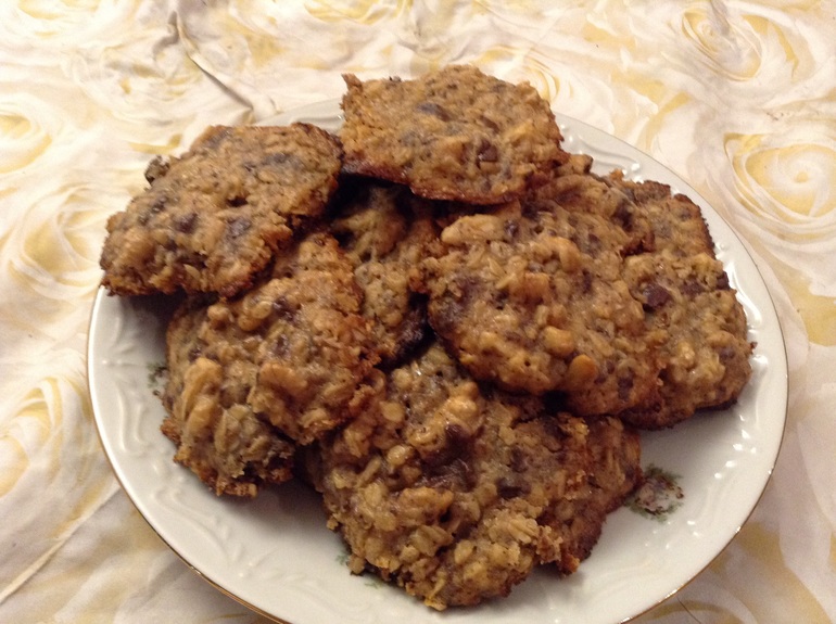 Из масла и меда сделать крем. Соединить с сахаром, ванильным сахаром и яйцом. Смешать муку, овсянку, разрыхлитель и добавить в масляный крем вместе с орехами и шоколадной крошкой.