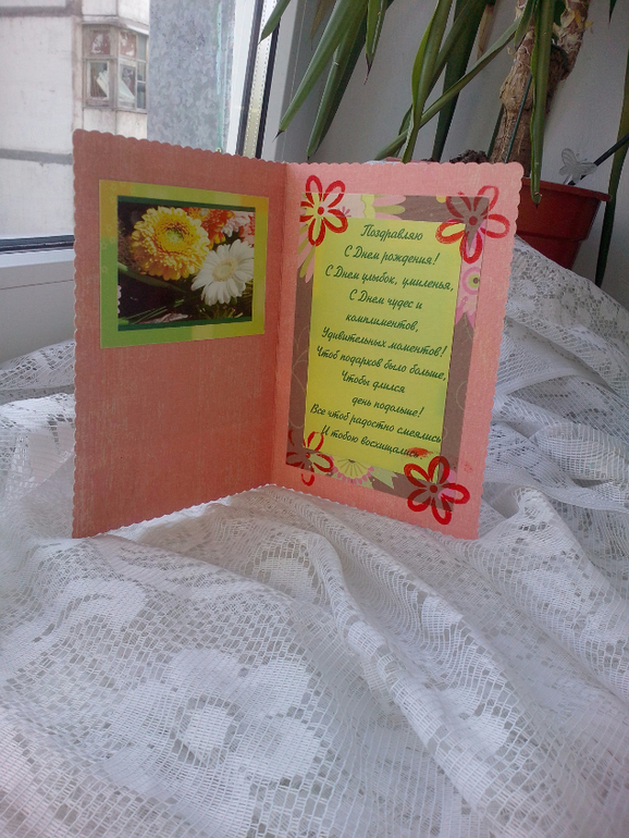 РукоделкиТак получилось, что подарок мы подарили раньше, чем нас пригласили на день рождения... Странно, да. Но, с пустыми руками не пойдешь, надо было что-то быстро придумывать. От начала работ до завершения минут 15 времени (причем 5 из них ушло на фотографирование результата;) ) и мешающийся ребенок))) Материалы: 2 кусочка скрап-бумаги, старая открытка, листовка с рекламой герберы (с цветочной выставки), кусок резной салфетки и детский штампик из набора .