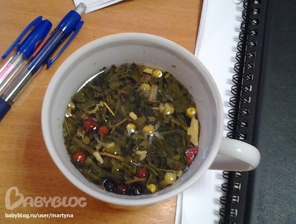 Там зеленый чай с ягодами боярышника, шиповника, можжевельника, лакричника, земляники, цветками ромашки, листьями крапивы и корицей.. :)))))