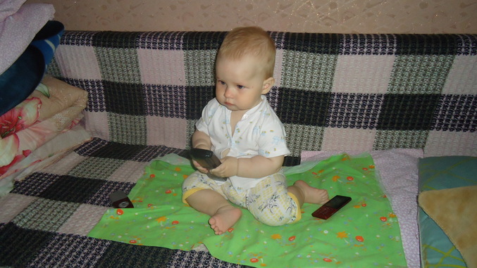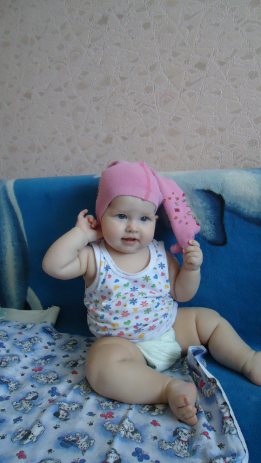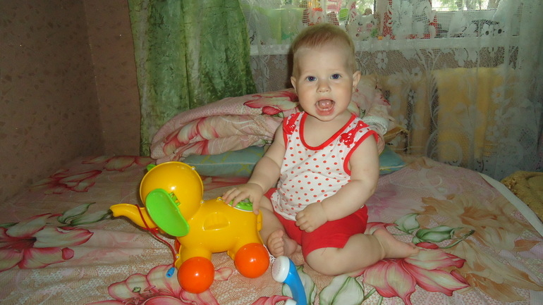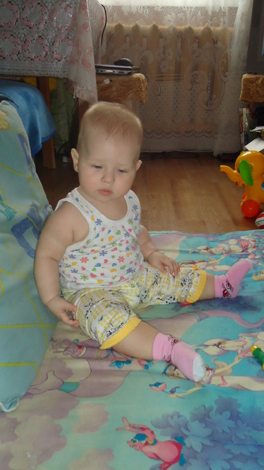 Блин, как время летит, скоро уже 10. Что мы имеем на сегодняшний день: все также 4 зуба, все истерит, десны верхние опухшие, болтает на своем тарабарском без умолку, спит 2 раза днем где-то по 40 минут, на ночь спать забирается очень рано в 19-20, просыпается в 6-7, иногда и до пол 8 спит, жаворонок)))) Все также НЕ ползаем и НЕ ходим. Ладушки делает уже давно, научилась собирать и разбирать пирамидку, очень нравятся музыкальные книжки.