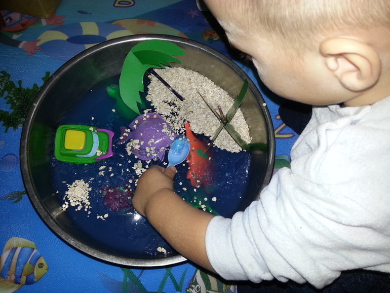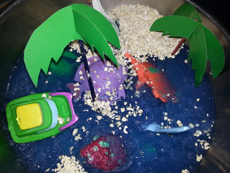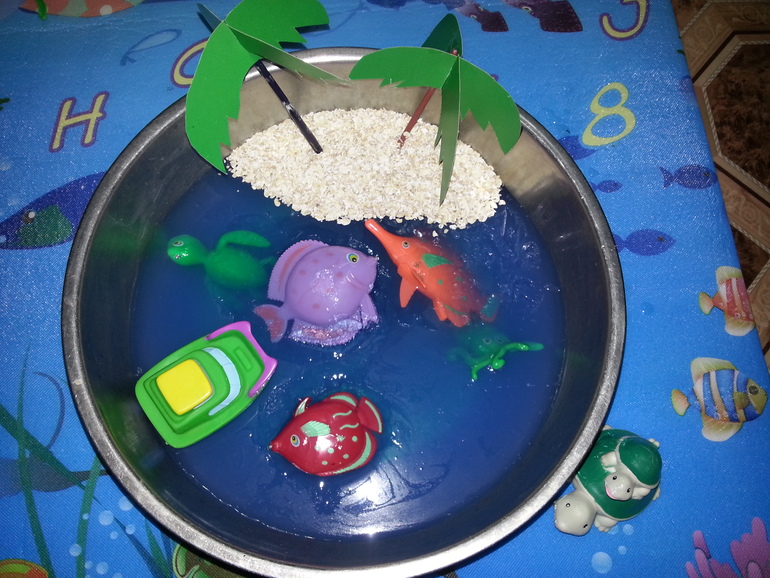 У нас было желатиновое море с рыбами, кальмарами, черепахами, кораблем, островом из овсянки и пальмами.