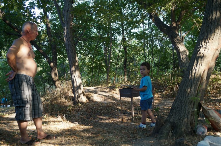 Вообще, я хотела, чтоб Митя поспал и часов в 16 идти в рощу. Но огромное количество народу конечно же не способствовало сну. Тем более, Колины родители собрались ехать в Туапсе вечером, т.е. у нас они не оставались, да и краснодарские гости тоже собирались вечером домой (бедные, с двумя детьми проехаться в Новороссийск и обратно - я б застрелилась точно!), поэтому с шашлыками нужно было не затягивать. Так что мы в несколько заходов перекусили салатом и кто-то съел еще тортик с чаем и пошли все в рощу.