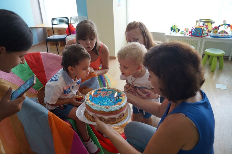 В конце в центр комнаты вынесли стул, застелили цветной тканью и стали петь каравай, садя в кресло кого-то из детей: сначала Алису, потом Сему, и в конце Митю. Каждый после песни получал подарок и шел целовать маму, а Мите в качестве подарка вынесли торт.Все вместе зажгли на нем свечи, Митя хоть в этот момент стал улыбаться, а то все время очень серьезный был.