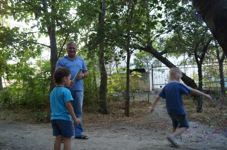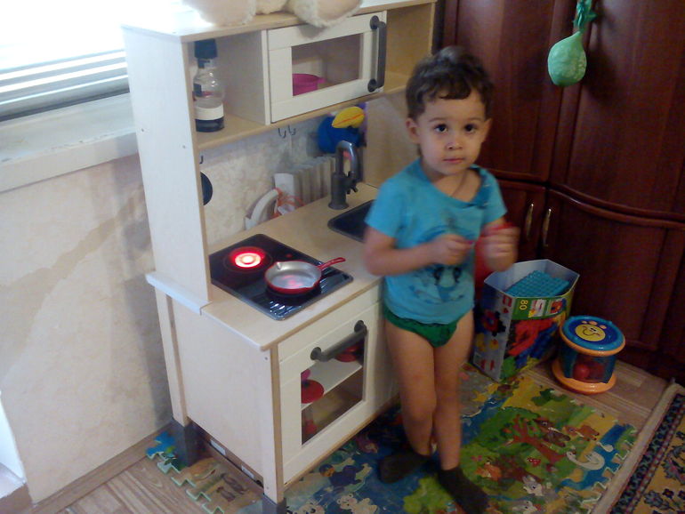 Потом приехали наши первые гости из Туапсе - Колины родители. Они притащили Мите кухню, которая заняла приличную часть нашей однушки. Я со свекром поехала забирать торт и покупать шары в Котик, Митя играл с бабушкой. Потом я быстро приготовила один салат, чтоб хоть что-то в доме было покушать, и стали мы собираться в Котик.
