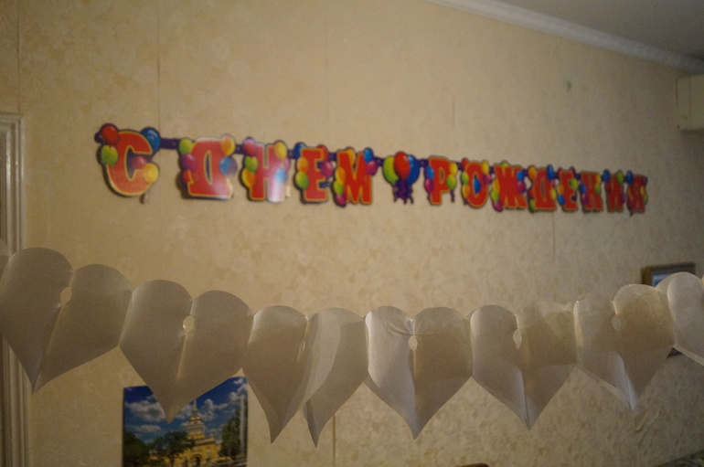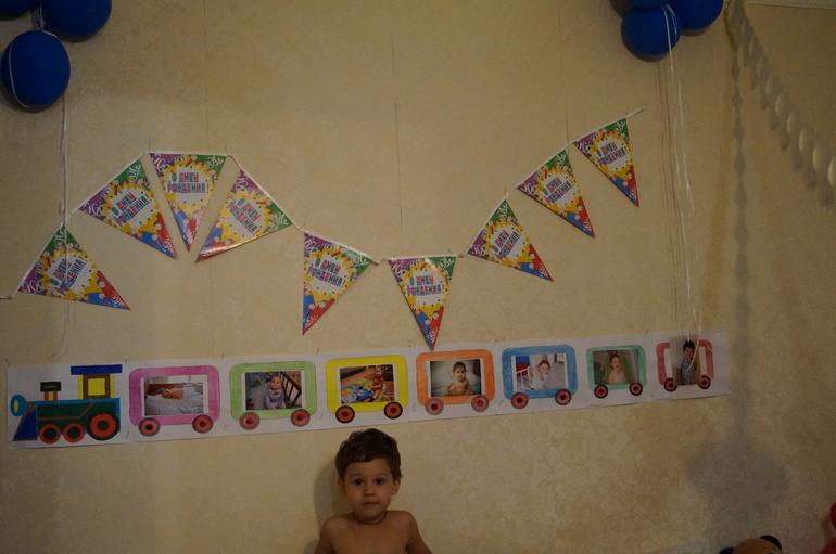 Накануне ДР, когда заяц уснул, я стала украшать комнату. Засыпал он, кстати, очень долго, так что я потом до 2х ночи надувала шары и цепляла плакаты. Устала ужасно!