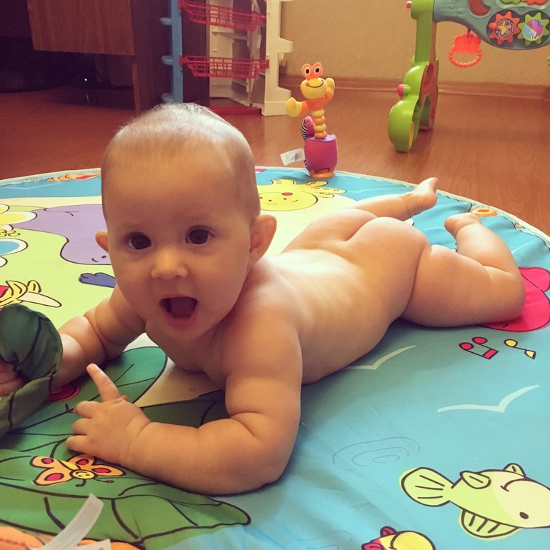 А 27.08, во второй день на море и на др Ксаниного дедушке, она наконец-то до конца сообразила, как переворачиваться на живот и как потом не путаясь в руках вернуться обратно на спину. Аллилуйя! Ребенок сначала научился вставать на почти четвереньки и сидеть, а потом переворачиваться) Вертелась на полу туда-сюда, даже с одеяла укатилась несколько раз. И с того дня она теперь все время вертится, так что только и приходится ловить.