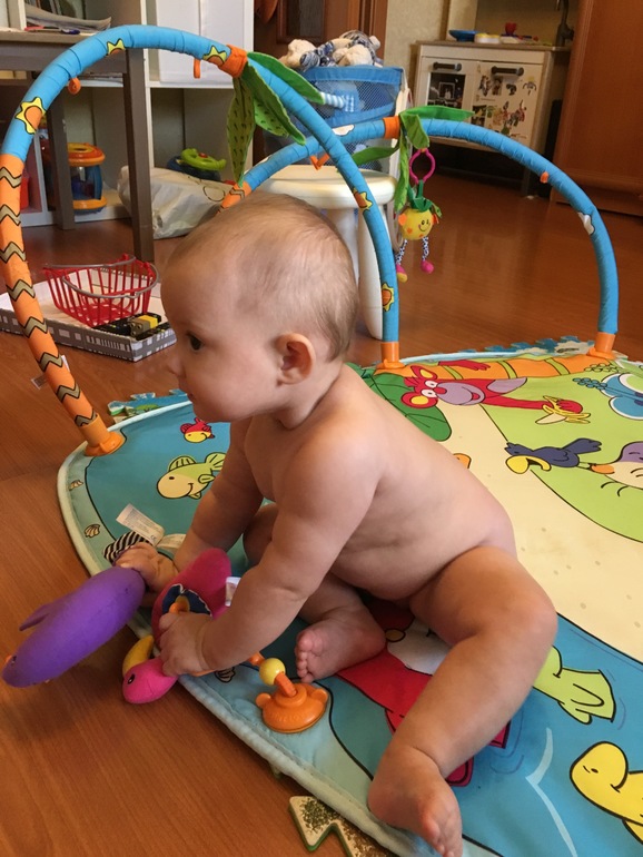 Ну и не знаю, поездка ли послужила толчком в развитии, или просто время пришло, но сразу после 6,5 мес, числа с 16, Алекс стала пробовать вставать на четвереньки. Получалось не очень, либо попа поднималась, либо верх туловища. Иногда немного все вместе приподнимала, но ноги чаще разъезжались в позу лягушечки. Но это было уже чем-то. Каждый день у нее получалось все лучше. И еще ей нравилось руками опереться об меня и раскачиваться взад-вперед.