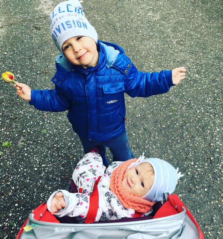 У нас, кстати, после зимы резко настало лето. Еще в 20х числах апреля я в теплых сапогах ходила, а к концу месяца уже пришлось шлепки доставать. Перепады жесткие, весны толком не было. Но тепло я конечно больше люблю, чем холод. Мы столько гуляли много, я даже бегать начала по программе на телефоне, где за 1,5 мес можно 30 мин без перерыва бежать. Но правда пришлось отложить без до приезда мужа. Малая в первый раз какашку собачью чуть не съела, пооблизывала всю. Второй раз по забору стала лезть, а лазит по лестницам она мастерски - за секунду выше моего роста забирается, но назад спускаться как правило ей лень, она просто руки отпускает и летит. А третий раз Митя вечно убегал в сторону разбитых стекол, она естественно за ним перлась. Я ругалась-ругалась, потом Митя ей еще большую улитку притащил и она пальцами залезла внутрь и вся в кишках была. Короче, на этом все и закончилось. Эх, а в моих мечтах все было так радужно - как раз стадион в середине двора, дверь закрыть можно и дети оттуда не уйдут.