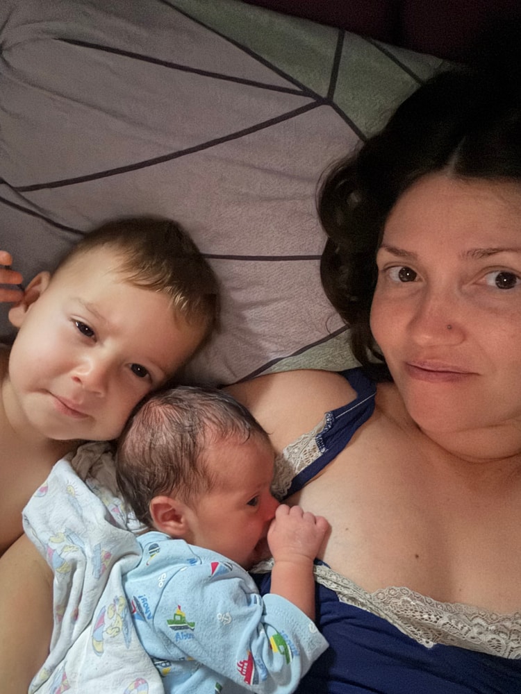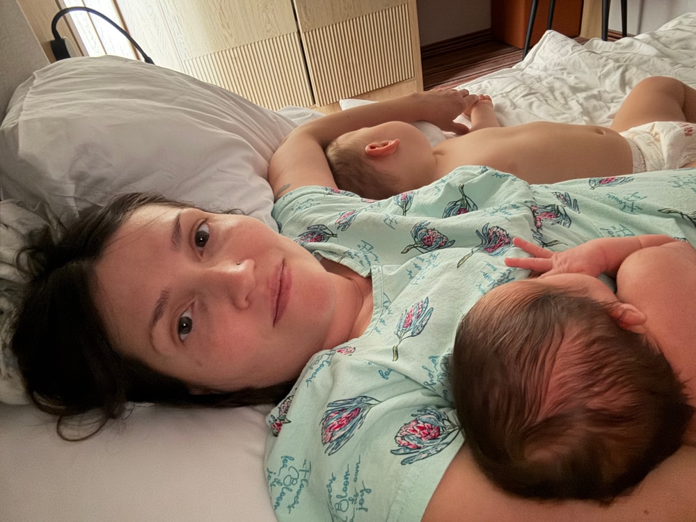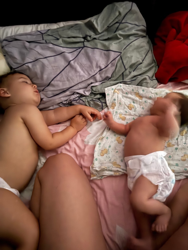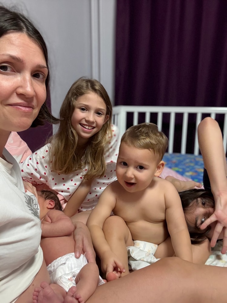 Дальше была ночь, когда малышка иногда плакала и Леон тоже начинал плакать. Он спал, как всегда, первую часть ночи в комнате Алекс на своей кроватке, а потом проснулся и Коля его принес к нам. Я планировала класть Асторию на приставную кроватку, но никак не получалось, она не спала сама и вообще не очень спала, надо было мне все время рядом лежать. И когда среди ночи принесли Леона, он стал лезть ко мне, а я боялась, что он придавит малышку. Короче, я всю ночь караулила, чтоб никто никого не придавил.