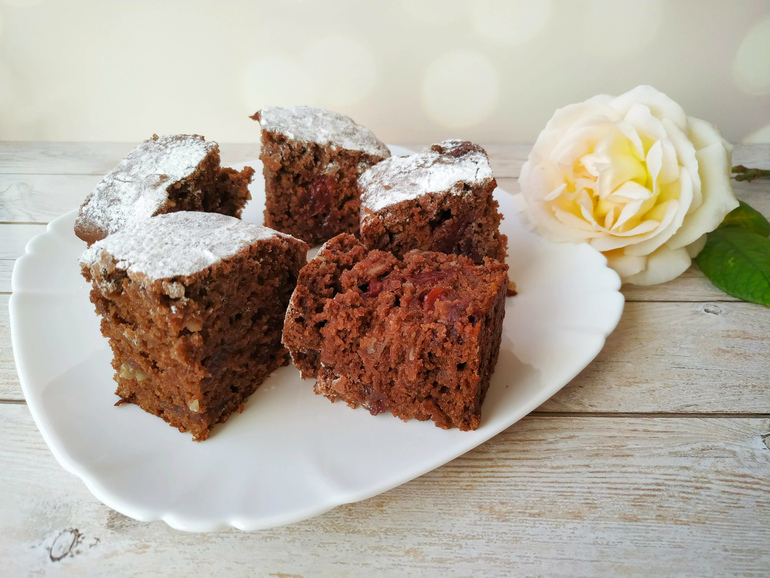 Готовим шоколадный брауни с вишней. Рецепт совершенно постный, не содержит яиц и молочных продуктов. К тому же, пирог готовится предельно просто, даже миксер не понадобится, все смешал ложкой и в духовку. Получается ароматным, с насыщенным шоколадным вкусом и легкой кислинкой от вишни. Попробуйте!
