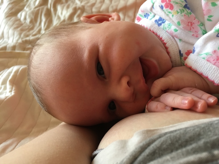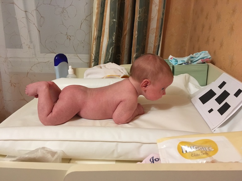 Если девочка в хорошем настроении, то может очень неплохо держать головку. Иногда спросонья одаривает нас осознанной улыбкой. У нас гв, совместный сон.