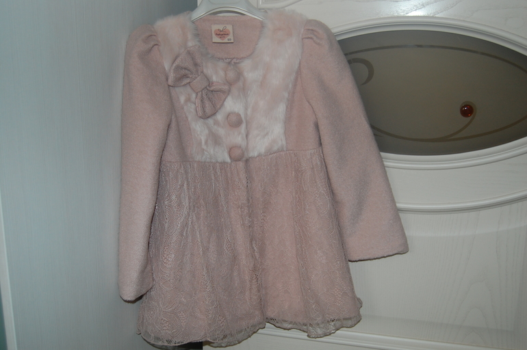 Пальто, одели один раз, очень нежное. 122рост идет в размер. На кружеве небольшая зацепка, на фото ее видно, но если знаешь и присматриваться. 900р