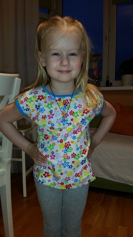 Хочу просто похвастаться футболочками. Спасибо за пост Ольги, там подсмотрела эти футболочки. Выкройка очень понравилась, шить одно удовольствие, быстро и красиво в итоге. На дочкин 104см роста и 16кг веса, брала размер 110, село по-моему отлично. Выкройка Отто 1/2014 модель 28.