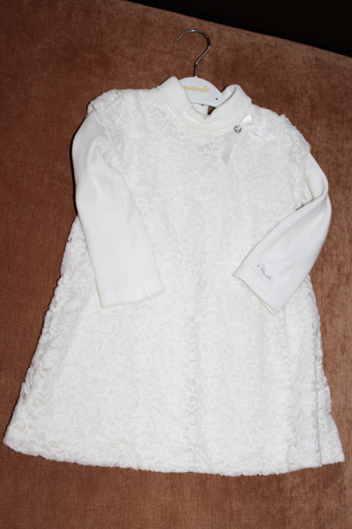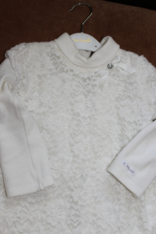 Детское платье (р.92 см) Berlingot б/у 2 раза, в отличном состоянии, без зацепок и потертостей. Белое кружево с набивными цветами на подкладке, спинка полностью на кнопках, воротничок и рукава х/б (обманка: как будто сарафан одет на водолазку), у ворота бантик с камушком. Очень нарядное и красивое.