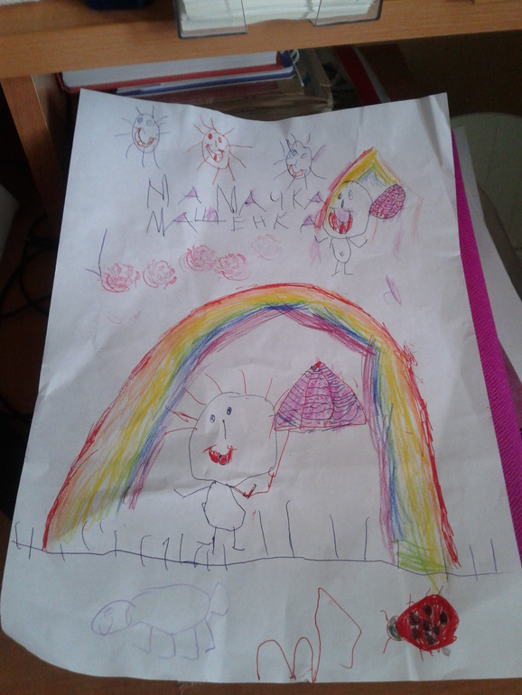 А многие так детишки. Может, напугалась чего или еще что. А может, просто черный нравится. Радужный — это избито,черный оригинальный) Зато сейчас настроение у нее поменялось, очень позитивный и яркий рисунок!