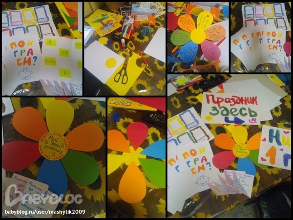 Конкурсные задания готовы;) будет ромашка (всего 6 лепесточков - 6 заданий), будут веселые фанты (12 бумажек с различными "мыслями малыша" о каждом госте!!), и будет конкурс с карточками (на знания памятных дат в жизни именинника!)