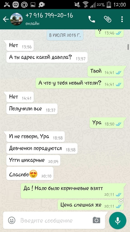 я тебе писала , что я в Крыму , увы в Москве у меня нет не друзей близких которые смогут открыть мою квартиру! не родственников вообще! когда всем отправляла, эту партию всем рзослала в первый же день прихода посылки! если не веришь, попрошу девочек показать фото точно таких же угг! да моя винна была , что я тебе вовремя не нашла, чтоб спросить адресс! я приехала только вчера утром!!!! и при этом узнала , что оказываеться мой свекор специально передал эти угги самолетом в Крым! могу попросить сфоткать мою маму твои угги на фоне аэропорта Симферополя.. боже столько геммороя вышло... блин я ж предупреждала что парти очень большая. все будет долго идти.... тем более ж сезон не проходит! до холодов еще много!