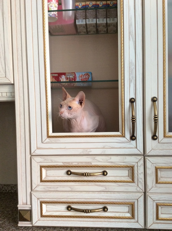 Хорошо, в витрину можно стекло вставить для симметрии. но коту совершенно необходима личная полка на этой кухне!)