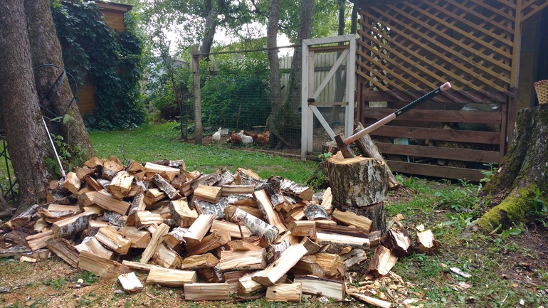 Но если траву я давно уже кошу газонокосилкой, то дрова - по старинке, колуном. Как дед научил. Опять же отличная разминка. Люблю.