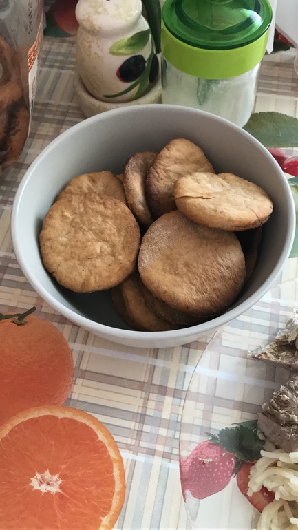 получилось нечто липкое типа пластилина. Поставить в холодильник на 30 мин. Достать, хорошо обвалять в муке и разделить на 6 частей и раскатать на тоооонкие коржики, как на наполеон (но я не очень тонко катала).Запекать при 200гр пока не начали коричневеть.