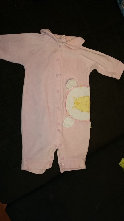 Велюровый, утепленный, внутри еще подкладка хлопковая, 500 р., покупался за 1700 р., практически новый, рост 74