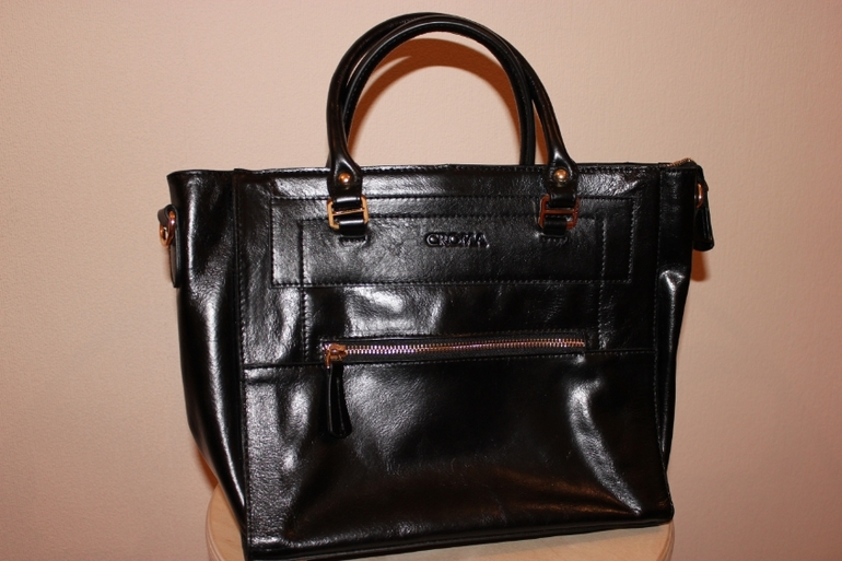 Высота 25, ширина 28, в глубину 11. Два отделения, разделенные отделением на молнии, внутри карман на молнии, карман для визиток и карман для тел. Натуральная кожа.