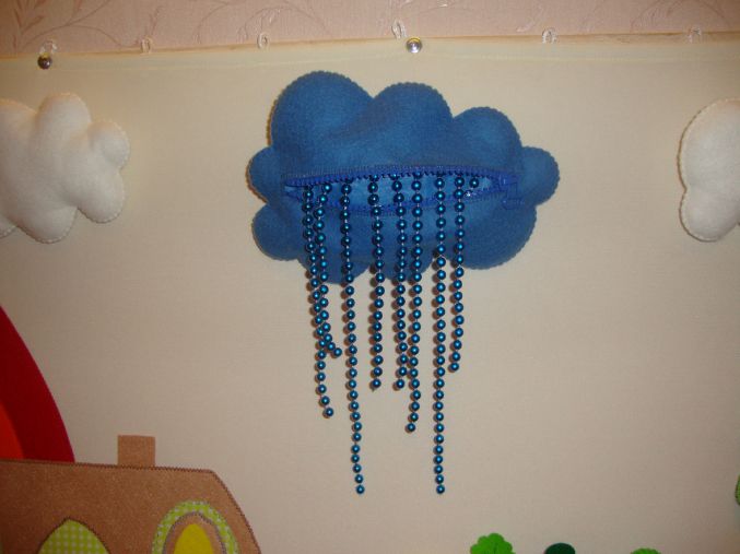 Все животные, овощи, части радуги, облака, солнышко, луна, крона дерева крепятся на липучке, кораблик плавает по речке, фрукты и снежинки крепятся на кнопках, крона дерева имеет сезонность (лето (зеленая), осень (желатая), зима (белая). Из синего облачка, расстегнув молнию, можно устроить дождик