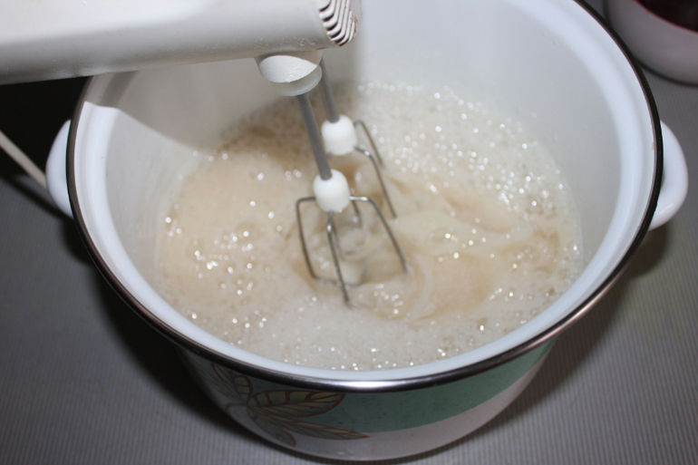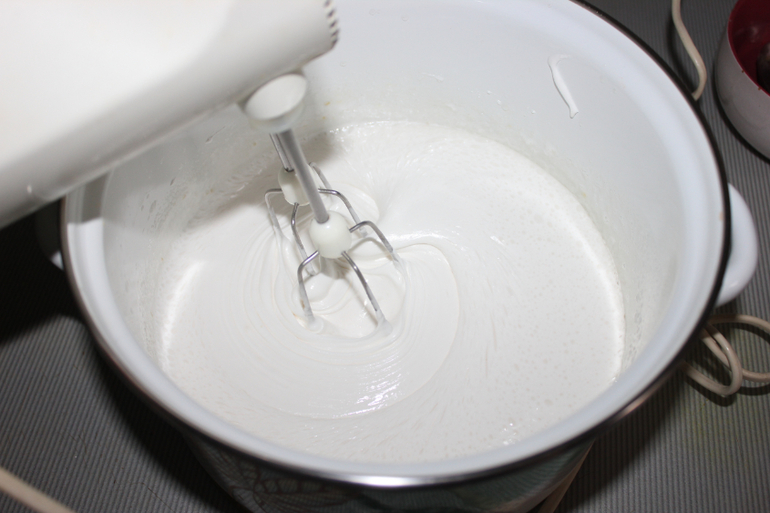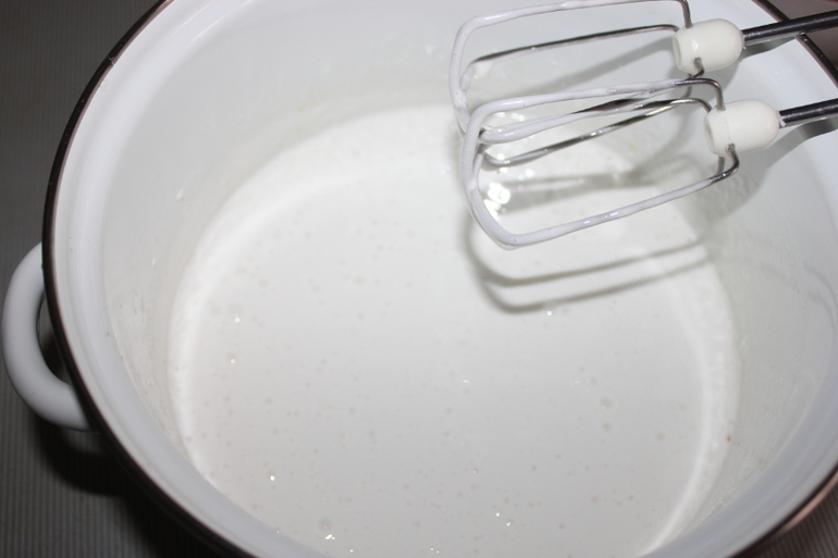 Горячую смесь взбиваем миксером на средней скорости пять минут