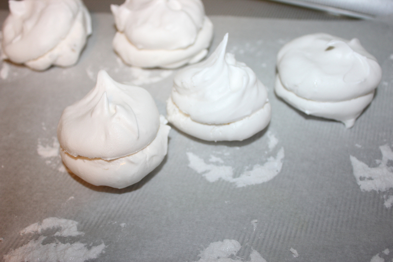 Когда зефир затвердеет,осторожно снимите с бумаги.Можно при помощи ножа.Я смачивала чуть руки,так легче было отлеплять и соедените половинки