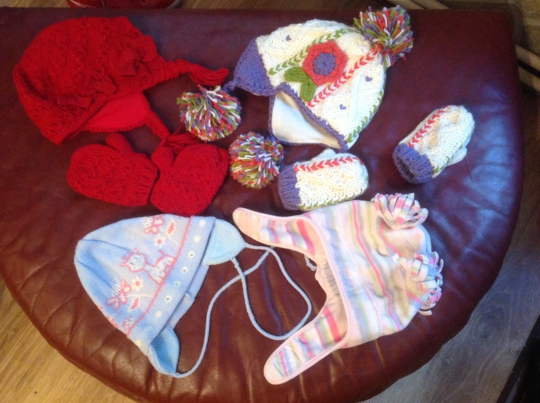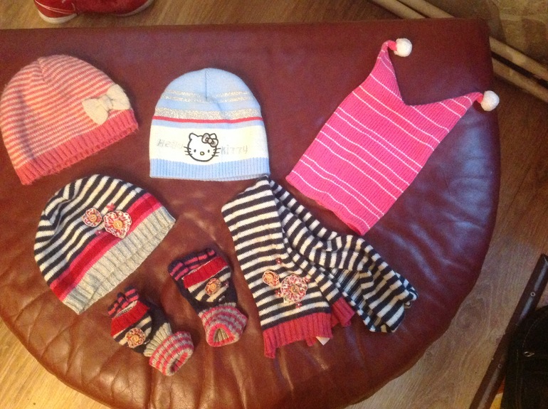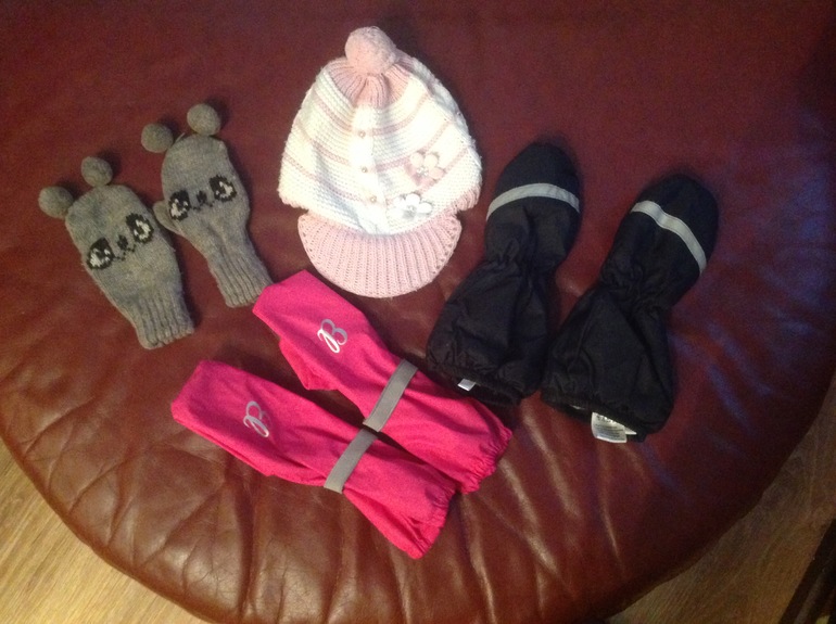 Варежки (марк. 3-6) 100, краги черные зимние (xs) на иск.меху 300, розовые резиновые (2-4) 100. Кепарик с цветочками 100.