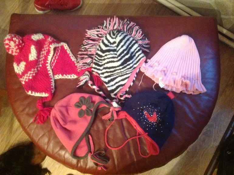 На 50-52. Розовая с сердечками 100, зебровая с шарфом 100, хлопковая Панама новая 100, розовая флисовая с цветком нет,, синяя шерстяная на флиса со стразами (сверху утерян бантик) 200.