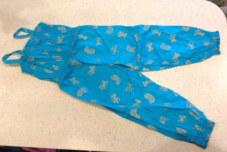 Летний комбинезон Мунсун, р.4-5. Лёгкий, хлопок 100%. Бабочки золотистые, на линии груди, по талии,, внизу штанин резинка. Ширина по груди в нерастянутом виде 25, по талии 26. Длина без лямок 71, внутр.шов штанины 41. Цена 500.