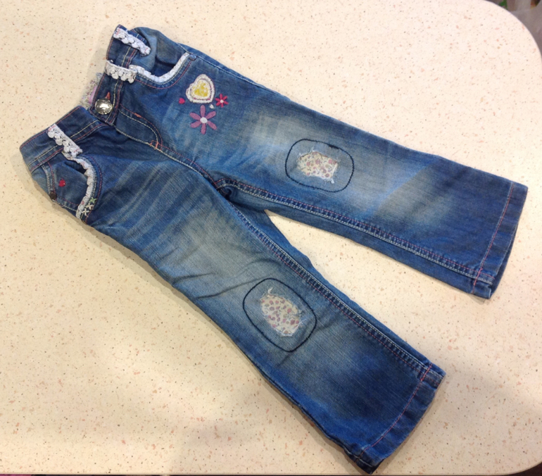 Джинсы Некст, 98. Спереди и сзади аппликация цветы и бабочки. В поясе утяжка. По поясу 26, длина штанин 52/36. Цена 400.