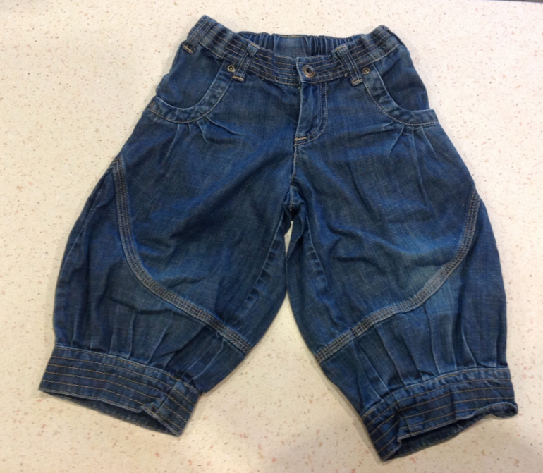 Бриджи, 98. Ткань под джинсу. Спереди и сзади по 2 кармашка-сердечка. В поясе утяжка. Подойдёт пухлячкам. По поясу 29. Длина штанин 47 (без подгиба). Цена 400.