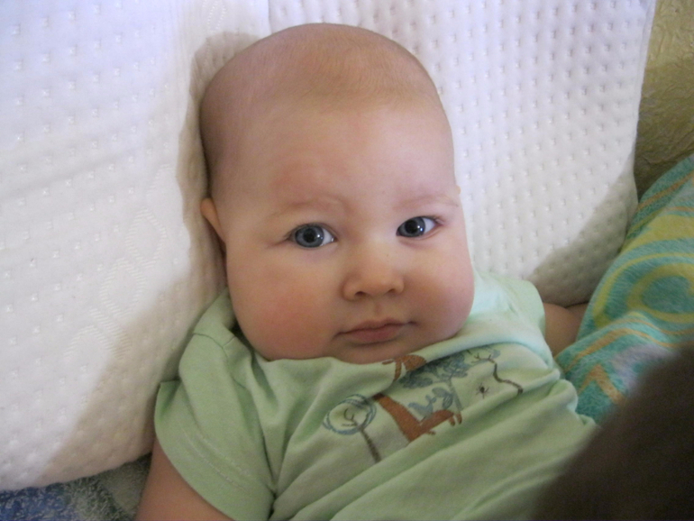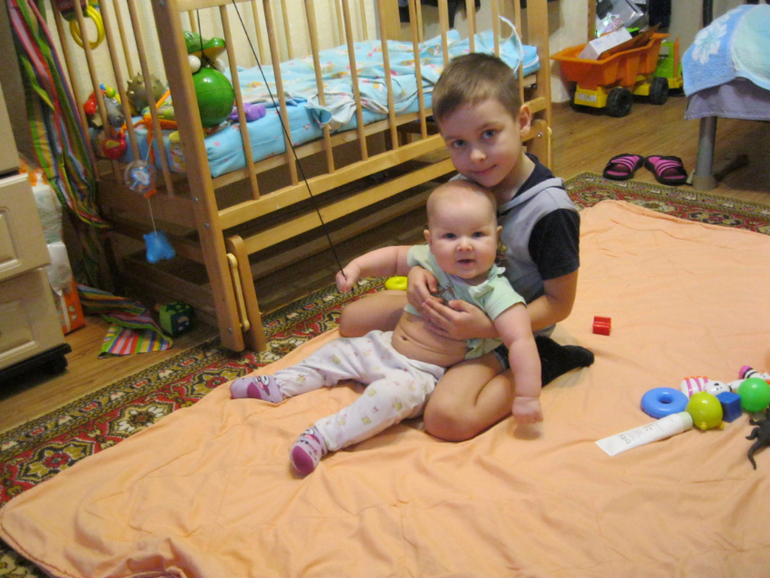 Сидит на руках как барин, разворачивается боком, руки в разные стороны - нелегко его так держать. Стараюсь меньше таскать уже. Постоянно требует внимания, иначе встанет и улетит затылком об пол.