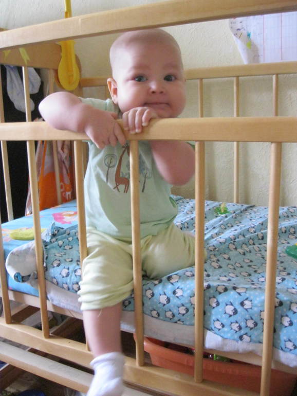 2. Научился садиться, держась за опору и сидеть так. Сам пока не сидит, только держась за кроватку.
