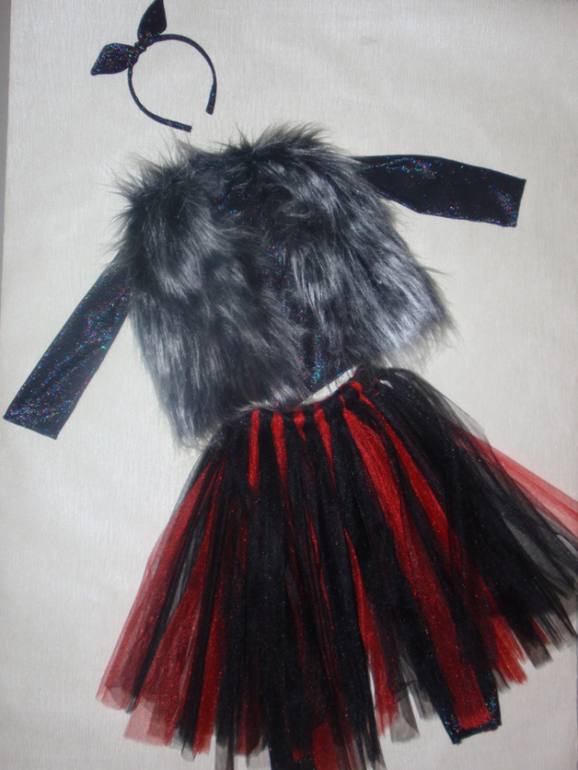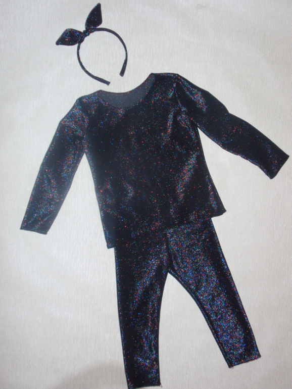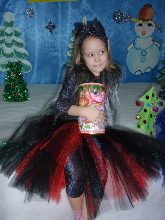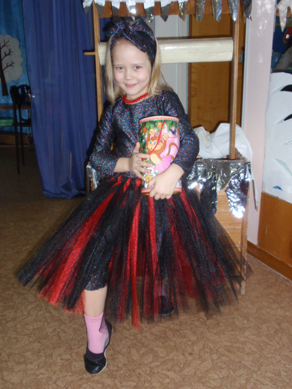 Выпала нам честь быть Бабкой -Ежкой, сначала дочь нормально восприняла это, но когда мы стали смотреть какие у нее костюмы, началась истерика. Поэтому костюм делали с расчетом , чтобы не хуже чем у Звездочки. Кофточку с лосинами шила из нарядной кофточки Ксюшиной прабабушки, и ободочек, но потом ободок не стали одевать т.к. он как то совсем потерялся, просто завязали оставшийся лоскут.
