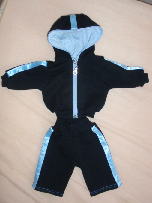 Из остатков от дочкиных джинс, и остатков от переделки сына сшилось и для куклы. Из черной кофточки, резиннку которой я использовала для штанов сына сшился такой костюм для Бэбика.Чтобы было не скучно украсила атласной лентой. Замок тоже с какого то старья сняла, обрезать мне его было жалко и я его по всему капюшону пустила, из-за него же пришлось делать подклад на капюшон, для чего были изрезаны старые пижамные штанишки дочери (правда она об этом не знает, а то начнется истерика, потому что похоже барахольщица еще та растет, вся в мать