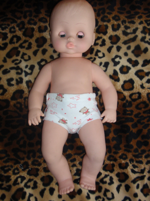 Дали нам в саду голого пупса и сказали его приодеть, сначала думала связать, даже штаны связала, а кофточка что -то не пошла, и решила я сшить.Сначала были трусики, из остатков от Ксюшиной пижамки(в итоге трусикисшились еще двум куклам и маечка)